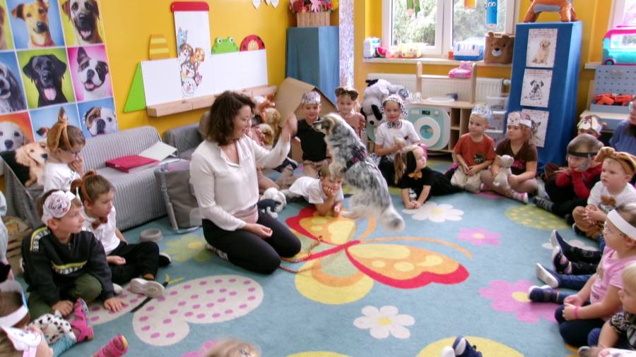 Dziś w naszym przedszkolu obchodziliśmy wyjątkowy dzień ? Dzień Psa! Z tej okazji odwiedziła nas Pani Ania-dogoterapeutka razem ze swoim czworonożnym przyjacielem ? suczką o imieniu Baki.
